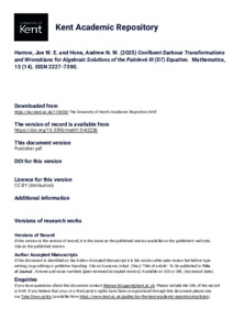 Harrow, Joe W. E., Hone, Andrew N. W. (2025) Confluent Darboux Transformations and Wronskians for Algebraic Solutions of the Painlevé III (D7) Equation. Mathematics, 13 (14). Article Number 2236. ISSN 2227-7390. (doi:10.3390/math13142236) (KAR id:110900)
