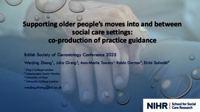 Zhang, Wenjing, Greig, Julia, Towers, Ann-Marie, Darton, Robin, Saloniki, Eirini (2025) Supporting older people’s moves into and between social care settings: co-production of practice guidance. In: British Society of Gerontology Conference 2025, 25-27 June 2025, Guildford, UK. (Unpublished) (KAR id:110977)