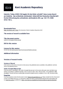 Heinrich, Tobias (2022) 'Ob Sappho für den Ruhm schreibt?' Anna Louisa Karsch als Celebrity. Das achtzehnte Jahrhundert: Zeitschrift der Deutschen Gesellschaft für die Erforschung des achtzehnten Jahrhunderts, (55). pp. 164-175. ISSN 0722-740-x. (KAR id:111023)