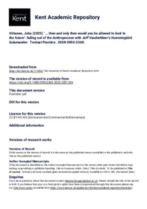 Virtanen, Juha (2025) ‘ … then and only then would you be allowed to look to the future’: falling out of the Anthropocene with Jeff VanderMeer’s Hummingbird Salamander. Textual Practice, . ISSN 0950-236X. E-ISSN 1470-1308. (doi:0.1080/0950236X.2025.2551339) (KAR id:111085)