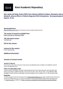 Butt, Aquib, Sadiq, Soban (2025) Does Adjuvant Metformin Reduce Olanzapine‐Induced Metabolic Adverse Effects in Patients Diagnosed With Schizophrenia. Neuropsychopharmacology Reports, 45 (4). Article Number e70061. E-ISSN 2574-173X. (doi:10.1002/npr2.70061) (KAR id:111372)