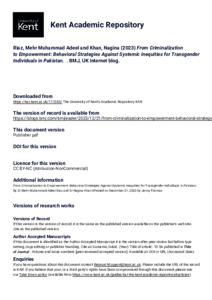 Riaz, Mehr Muhammad Adeel, Khan, Nagina (2023) From Criminalization to Empowerment: Behavioral Strategies Against Systemic Inequities for Transgender Individuals in Pakistan. . BMJ, UK internet blog. (KAR id:111385)