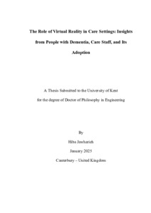 Jawharieh, Hiba (2025) The role of virtual reality in care settings: insights from people with dementia, care staff, and its adoption. Doctor of Philosophy (PhD) thesis, University of Kent. (doi:10.22024/UniKent/01.02.111643) (KAR id:111643)