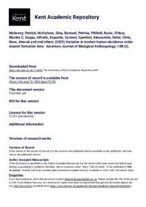 Mahoney, Patrick, McFarlane, Gina, Barnard, Petrina, Pitfield, Rosie, O'Hara, Mackie C, Coppa, Alfredo, Esposito, Carmen, Sperduti, Alessandra, Deter, Chris, Nava, Alessia, and others. (2025) Variation in modern human deciduous molar enamel formation time. American Journal of Biological Anthropology, 188 (3). Article Number e70156. E-ISSN 2692-7691. (doi:10.1002/ajpa.70156) (KAR id:111806)