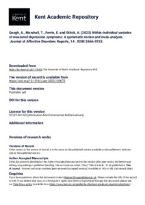 Gough, A., Marshall, T., Ferris, E., Stitch, A. (2023) Within-individual variation of measured depression symptoms: A systematic review and meta-analysis. Journal of Affective Disorders Reports, 14 . Article Number 100675. ISSN 2666-9153. (doi:10.1016/j.jadr.2023.100675) (KAR id:111950)