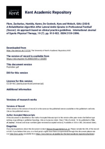 Flore, Zacharias, Hambly, Karen, De Coninck, Kyra, Welsch, Götz (2024) A Rehabilitation Algorithm After Lateral Ankle Sprains in Professional Football (Soccer): An approach based on clinical practice guidelines. International Journal of Sports Physical Therapy, 19 (7). pp. 910-922. ISSN 2159-2896. (doi:10.26603/001c.120205) (KAR id:112128)