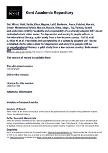 Gul, Mirrat, Abid, Sadia, Khan, Nagina, Latif, Madeeha, Awan, Falahat, Husain, Omair, Muhammad Ishrat, Husain, Husain, Mina, Magsi, Taj, Farooq, Saeed, and others. (2025) Feasibility and acceptability of a culturally adapted CBT-based ‘animated shorts video series’ for depression and anxiety in people with no or low educational literacy: a pilot study from a low-income country. Behavioural and Cognitive Psychotherapy, . ISSN 1352-4658. E-ISSN 1469-1833. (doi:10.1017/S1352465825101173) (KAR id:112179)
