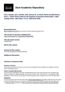 Zorzi, Chantal, Jean, Jennifer, Côté, Sylvana M., St-André, Martin, MacKinnon, Anna L. (2025) Virtual reality for the treatment of perinatal mental health: a rapid scoping review. BMJ Open, 15 (12). Article Number e094901. ISSN 2044-6055. (doi:10.1136/bmjopen-2024-094901) (KAR id:112199)