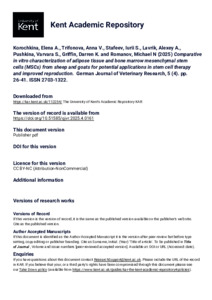 Korochkina, Elena A., Trifonova, Anna V., Stafeev, Iurii S., Lavrik, Alexey A., Pushkina, Varvara S., Griffin, Darren K., Romanov, Michael N (2025) Comparative in vitro characterization of adipose tissue and bone marrow mesenchymal stem cells (MSCs) from sheep and goats for potential applications in stem cell therapy and improved reproduction. German Journal of Veterinary Research, 5 (4). pp. 26-41. ISSN 2703-1322. (doi:10.51585/gjvr.2025.4.0161) (KAR id:112254)