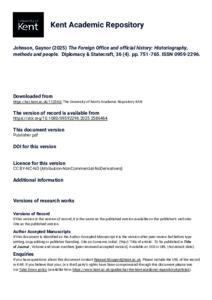 Johnson, Gaynor (2025) The Foreign Office and official history: Historiography, methods and people. Diplomacy & Statecraft, 36 (4). pp. 751-765. ISSN 0959-2296. (doi:10.1080/09592296.2025.2586464) (KAR id:112543)