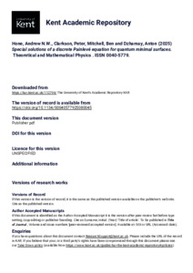 Hone, Andrew N.W., Clarkson, Peter, Mitchell, Ben, Dzhamay, Anton (2025) Special solutions of a discrete Painlevé equation for quantum minimal surfaces. Theoretical and Mathematical Physics, . ISSN 0040-5779. (doi:10.1134/S0040577925080045) (KAR id:112796)