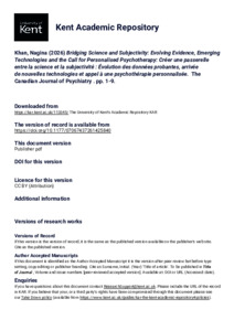 Khan, Nagina (2026) Bridging Science and Subjectivity: Evolving Evidence, Emerging Technologies and the Call for Personalised Psychotherapy: Créer une passerelle entre la science et la subjectivité : Évolution des données probantes, arrivée de nouvelles technologies et appel à une psychothérapie personnalisée. The Canadian Journal of Psychiatry, . pp. 1-9. (KAR id:113345)