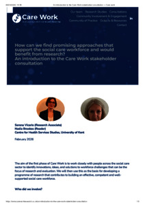 Vicario, Serena, Brookes, Nadia (2026) How can we find promising approaches that support the social care workforce and would benefit from research? An introduction to the Care Work stakeholder consultation. . University of Kent Online publication. (KAR id:113363)