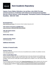 Onyema, Franca Chidera, Richardson, Lisa, Rose, John (2026) The views and lived experiences of individuals with intellectual and developmental disabilities who live in secure services: a meta-ethnography. International Journal of Developmental Disabilities, . ISSN 2047-3869. (doi:10.1080/20473869.2026.2632854) (KAR id:113441)