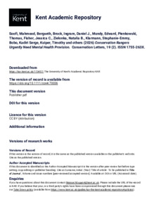 Soofi, Mahmood, Bergseth, Brock, Ingram, Daniel J., Mundy, Edward, Pienkowski, Thomas, Fisher, Jessica C., Zielonka, Natalia B., Klarmann, Stephanie‐Emmy, Bobo, Kadiri Serge, Kuiper, Timothy, and others. (2026) Conservation Rangers Urgently Need Mental Health Provision. Conservation Letters, 19 (2). Article Number e70036. ISSN 1755-263X. (doi:10.1111/con4.70036) (KAR id:113457)