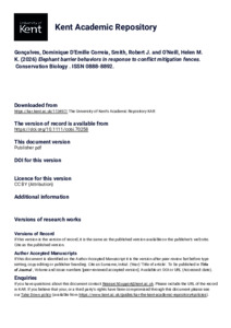 Gonçalves, Dominique D'Emille Correia, Smith, Robert J., O'Neill, Helen M. K. (2026) Elephant barrier behaviors in response to conflict mitigation fences. Conservation Biology, . Article Number e70258. ISSN 0888-8892. E-ISSN 1523-1739. (doi:10.1111/cobi.70258) (KAR id:113497)