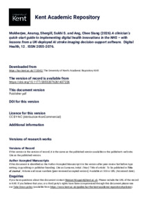 Mukherjee, Anurup, Shergill, Sukhi S., Ang, Chee Siang (2026) A clinician’s quick‑start guide to implementing digital health innovations in the NHS – with lessons from a UK-deployed AI stroke imaging decision-support software. Digital Health, 12 . ISSN 2055-2076. (doi:10.1177/20552076261437226) (KAR id:113542)