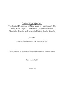 Dice, Jack (2026) Spanning Spaces: The Spatial Perception of New York in Hart Crane's 'The Bridge', Lola Ridge's 'The Ghetto', John Dos Passos' 'Manhattan Transfer', and James Baldwin's 'Another Country'. Doctor of Philosophy (PhD) thesis, University of Kent,. (doi:10.22024/UniKent/01.02.113544) (KAR id:113544)
