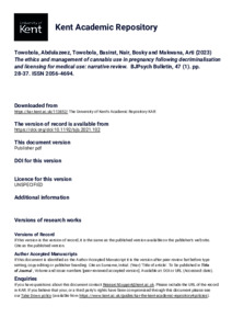 Towobola, Abdulazeez, Towobola, Basirat, Nair, Bosky, Makwana, Arti (2023) The ethics and management of cannabis use in pregnancy following decriminalisation and licensing for medical use: narrative review. BJPsych Bulletin, 47 (1). pp. 28-37. ISSN 2056-4694. (doi:10.1192/bjb.2021.102) (KAR id:113852)