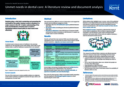 Makwana, Arti, Watkinson, Ruth, Coughlan, James, Walker, Susie, Peckham, Stephen (2024) Unmet needs in dental care: A literature review and document analysis. [Conference item] (Unpublished) (KAR id:113854)