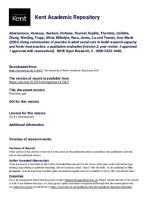 Abrahamson, Vanessa, Hashem, Ferhana, Fournel, Sophie, Thornton, Collette, Zhang, Wenjing, Trapp, Olivia, Mikelyte, Rasa, Jones, Liz, Towers, Ann-Marie (2026) Using communities of practice in adult social care to build research capacity and foster best practice: a qualitative evaluation [version 2; peer review: 3 approved, 1 approved with reservations]. NIHR Open Research, 5 . Article Number 124. ISSN 2633-4402. (doi:10.3310/nihropenres.14134.2) (KAR id:114047)