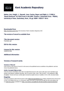Netten, Ann, Knight, J., Dennett, Jane, Cooley, Roger, Slight, A. (1998) A ''Ready Reckoner'' for Staff Costs in the NHS, Volume I, Estimated Costs. PSSRU, University of Kent, Canterbury, Kent., 93 pp. ISBN 1-902671-06-6. (KAR id:21575)