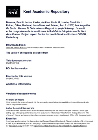 Dervaux, Benoit and Lenne, Xavier and Jenkins, Linda M. and Hastie, Charlotte L. and Poirier, Gilles and Marissal, Jean-Pierre and Palmer, Ann P. (2007) Les Inegalites De Sante : Mesure Et Determinants Rapport du projet Interreg : La santé et les comportements de santé dans le Sud-Est de l’Angleterre et le Nord de la France. Project report. Centre for Health Services Studies / COSPH, Canterbury (KAR id:33283)