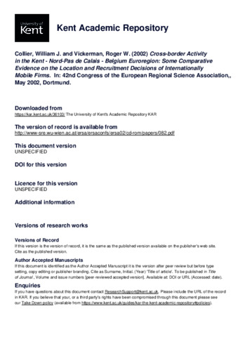 Collier, William J., Vickerman, Roger W. (2002) Cross-border Activity in the Kent - Nord-Pas de Calais - Belgium Euroregion: Some Comparative Evidence on the Location and Recruitment Decisions of Internationally Mobile Firms. In: 42nd Congress of the European Regional Science Association,, May 2002, Dortmund. (KAR id:36103)