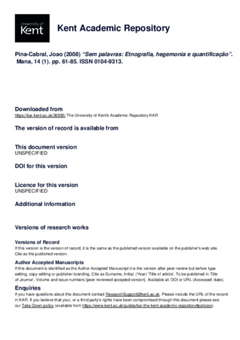 Pina-Cabral, Joao (2008) “Sem palavras: Etnografia, hegemonia e quantificação”. Mana, 14 (1). pp. 61-85. ISSN 0104-9313. (KAR id:36995)