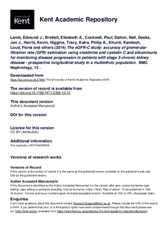 Lamb, Edmund J., Brettell, Elizabeth A., Cockwell, Paul, Dalton, Neil, Deeks, Jon J., Harris, Kevin, Higgins, Tracy, Kalra, Philip A., Khunti, Kamlesh, Loud, Fiona, and others. (2014) The eGFR-C study: accuracy of glomerular filtration rate (GFR) estimation using creatinine and cystatin C and albuminuria for monitoring disease progression in patients with stage 3 chronic kidney disease - prospective longitudinal study in a multiethnic population. BMC Nephrology, 15 . Article Number 13. E-ISSN 1471-2369. (doi:10.1186/1471-2369-15-13) (KAR id:37806)