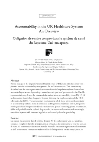 Peckham, Stephen (2014) Accountability in the UK Healthcare System: An Overview. Healthcare Policy, (10(SP)). pp. 155-162. ISSN 1715-6572. (doi:10.12927/hcpol.2014.23914) (KAR id:42031)