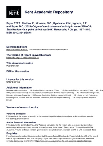 Sayle, T.X.T., Caddeo, F., Monama, N.O., Kgatwane, K.M., Ngoepe, P.E., Sayle, D.C. (2015) Origin of electrochemical activity in nano-Li2MnO3; Stabilization via a 'point defect scaffold'. Nanoscale, 7 (3). pp. 1167-1180. ISSN 20403364 (ISSN). (doi:10.1039/c4nr05551a) (KAR id:46767)