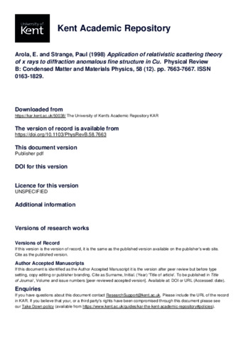 Arola, E., Strange, Paul (1998) Application of relativistic scattering theory of x rays to diffraction anomalous fine structure in Cu. Physical Review B: Condensed Matter and Materials Physics, 58 (12). pp. 7663-7667. ISSN 0163-1829. (doi:10.1103/PhysRevB.58.7663) (KAR id:50038)
