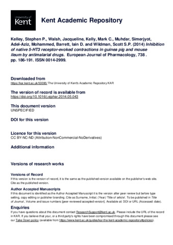 Kelley, Stephen P., Walsh, Jacqueline, Kelly, Mark C., Muhdar, Simerjyot, Adel-Aziz, Mohammed, Barrett, Iain D., Wildman, Scott S.P. (2014) Inhibition of native 5-HT3 receptor-evoked contractions in guinea pig and mouse ileum by antimalarial drugs. European Journal of Pharmacology, 738 . pp. 186-191. ISSN 0014-2999. (doi:10.1016/j.ejphar.2014.05.043) (KAR id:53095)