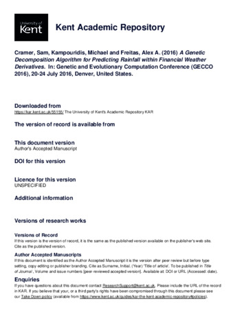 Cramer, Sam, Kampouridis, Michael, Freitas, Alex A. (2016) A Genetic Decomposition Algorithm for Predicting Rainfall within Financial Weather Derivatives. In: Genetic and Evolutionary Computation Conference (GECCO 2016), 20-24 July 2016, Denver, United States. (doi:10.1145/2908812.2908894) (KAR id:55155)