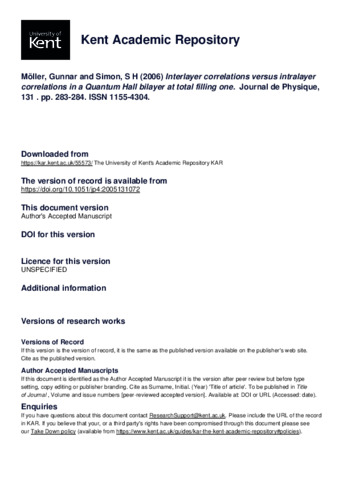 Möller, Gunnar, Simon, S H (2006) Interlayer correlations versus intralayer correlations in a Quantum Hall bilayer at total filling one. Journal de Physique, 131 . pp. 283-284. ISSN 1155-4304. (doi:10.1051/jp4:2005131072) (KAR id:55573)
