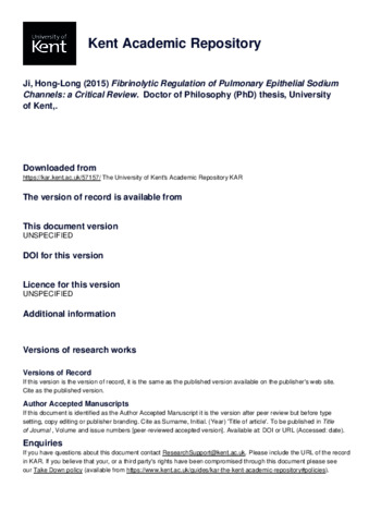 Ji, Hong-Long (2015) Fibrinolytic Regulation of Pulmonary Epithelial Sodium Channels: a Critical Review. Doctor of Philosophy (PhD) thesis, University of Kent,. (KAR id:57157)