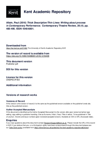 Allain, Paul (2016) Thick Description/Thin Lines: Writing about process in Contemporary Performance. Contemporary Theatre Review, 26 (4). pp. 485-495. ISSN 1048-6801. (doi:10.1080/10486801.2016.1216409) (KAR id:57466)