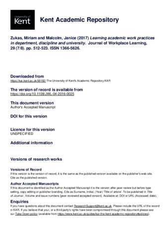 Zukas, Miriam, Malcolm, Janice (2017) Learning academic work practices in department, discipline and university. Journal of Workplace Learning, 29 (7/8). pp. 512-523. ISSN 1366-5626. (doi:10.1108/JWL-04-2016-0025) (KAR id:58182)