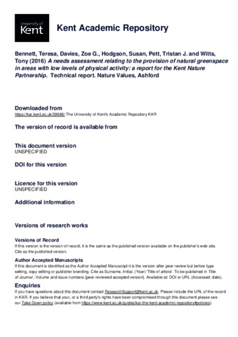 Bennett, Teresa and Davies, Zoe G. and Hodgson, Susan and Pett, Tristan J. and Witts, Tony (2016) A needs assessment relating to the provision of natural greenspace in areas with low levels of physical activity: a report for the Kent Nature Partnership. Technical report. Nature Values, Ashford (KAR id:59666)