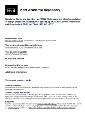 Samdanis, Marios, Lee, Soo Hee (2017) White space and digital remediation of design practice in architecture: A case study of Frank O. Gehry. Information and Organization, 27 (2). pp. 73-86. ISSN 1471-7727. (doi:10.1016/j.infoandorg.2017.02.001) (KAR id:61357)