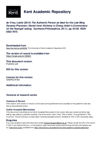 de Vries, Leslie (2014) The Authentic Person as Ideal for the Late Ming Dynasty Physician: Daoist Inner Alchemy in Zhang Jiebin’s Commentary on the Huangdi neijing. Synthesis Philosophica, 29 (1). pp. 63-82. ISSN 0352-7875. (KAR id:65850)