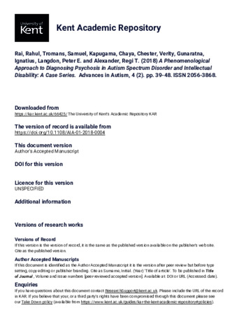 Rai, Rahul, Tromans, Samuel, Kapugama, Chaya, Chester, Verity, Gunaratna, Ignatius, Langdon, Peter E., Alexander, Regi T. (2018) A Phenomenological Approach to Diagnosing Psychosis in Autism Spectrum Disorder and Intellectual Disability: A Case Series. Advances in Autism, 4 (2). pp. 39-48. ISSN 2056-3868. (doi:10.1108/AIA-01-2018-0004) (KAR id:66425)