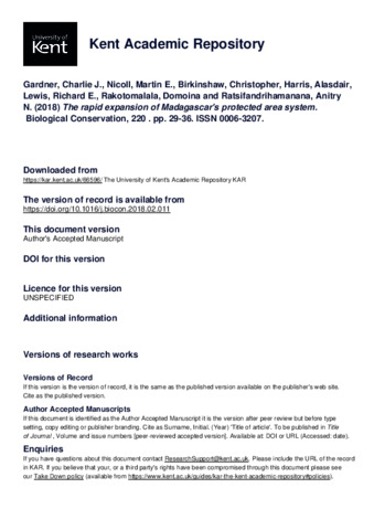 Gardner, Charlie J., Nicoll, Martin E., Birkinshaw, Christopher, Harris, Alasdair, Lewis, Richard E., Rakotomalala, Domoina, Ratsifandrihamanana, Anitry N. (2018) The rapid expansion of Madagascar's protected area system. Biological Conservation, 220 . pp. 29-36. ISSN 0006-3207. (doi:10.1016/j.biocon.2018.02.011) (KAR id:66596)