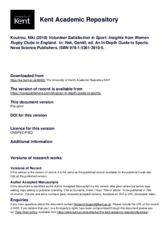 Koutrou, Niki (2018) Volunteer Satisfaction in Sport: Insights from Women Rugby Clubs in England. In: Hak, Daniël, ed. An In-Depth Guide to Sports. Nova Science Publishers. ISBN 978-1-5361-3910-5. (KAR id:66905)