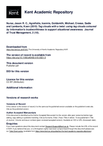 Nurse, Jason R. C., Agrafiotis, Ioannis, Goldsmith, Michael, Creese, Sadie, Lamberts, Koen (2015) Tag clouds with a twist: using tag clouds coloured by information's trustworthiness to support situational awareness. Journal of Trust Management, 2 (10). E-ISSN 2196-064X. (doi:10.1186/s40493-015-0021-5) (KAR id:67501)