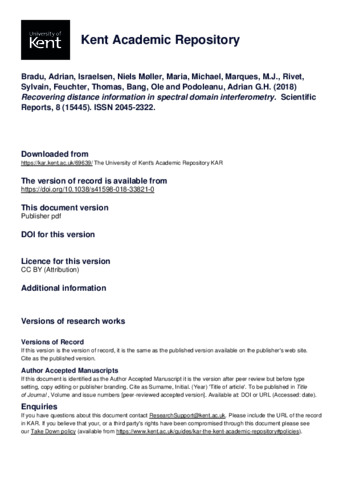 Bradu, Adrian, Israelsen, Niels Møller, Maria, Michael, Marques, M.J., Rivet, Sylvain, Feuchter, Thomas, Bang, Ole, Podoleanu, Adrian G.H. (2018) Recovering distance information in spectral domain interferometry. Scientific Reports, 8 (15445). ISSN 2045-2322. (doi:10.1038/s41598-018-33821-0) (KAR id:69639)