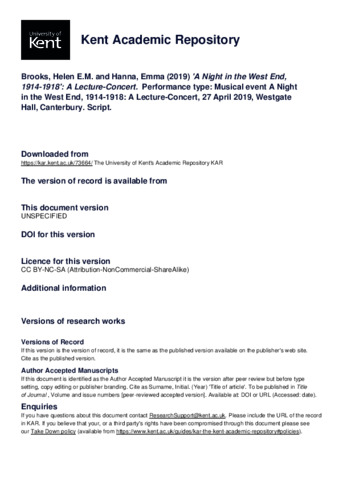 Brooks, Helen E.M. and Hanna, Emma (2019) 'A Night in the West End, 1914-1918': A Lecture-Concert. Performance type: Musical event A Night in the West End, 1914-1918: A Lecture-Concert, 27 April 2019, Westgate Hall, Canterbury. Script. (KAR id:73664)