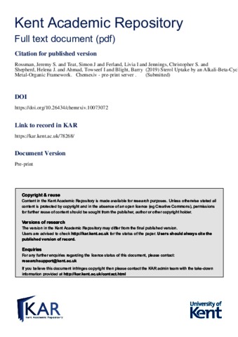 Blight, Barry A., Ahmad, Towseef I., Shepherd, Helena J., Jennings, Christopher S., Ferland, Livia I., Teat, Simon J., Rossman, Jeremy S. (2019) Sterol Uptake by an Alkali-β-Cyclodextrin Metal–Organic Framework. Crystal Growth and Design, 20 (1). pp. 43-48. ISSN 1528-7483. (doi:10.1021/acs.cgd.9b01457) (KAR id:78268)