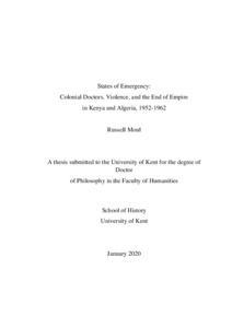 Moul, Russell (2020) States of Emergency: Colonial Doctors, Violence, and the End of Empire in Kenya and Algeria, 1952-1962. Doctor of Philosophy (PhD) thesis, University of Kent,. (KAR id:81911)